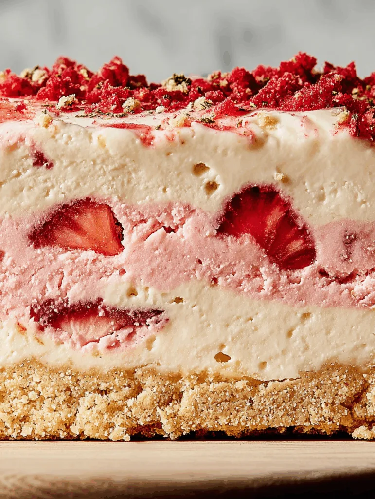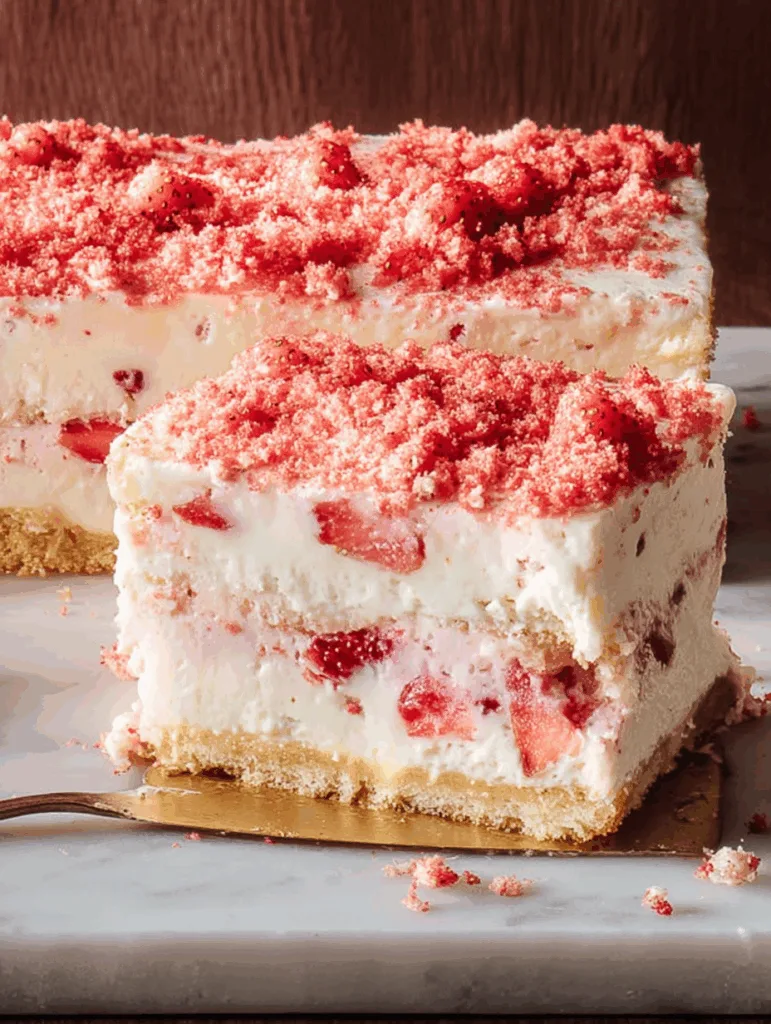 Feeling fancy? Sprinkle extra crushed freeze-dried strawberries on top or drizzle some white chocolate sauce for an extra flair. A few whipped cream swirls or a dusting of cookie crumbs can turn this cake into the star of your dessert table. Try serving slices on chilled plates to keep them firm longer.
