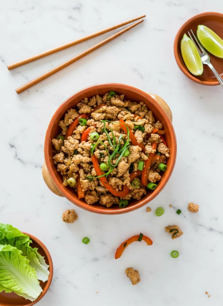 Crunchy lettuce cups filled with flavorful Thai chicken stir-fry – a healthy meal ready in 15 minutes!