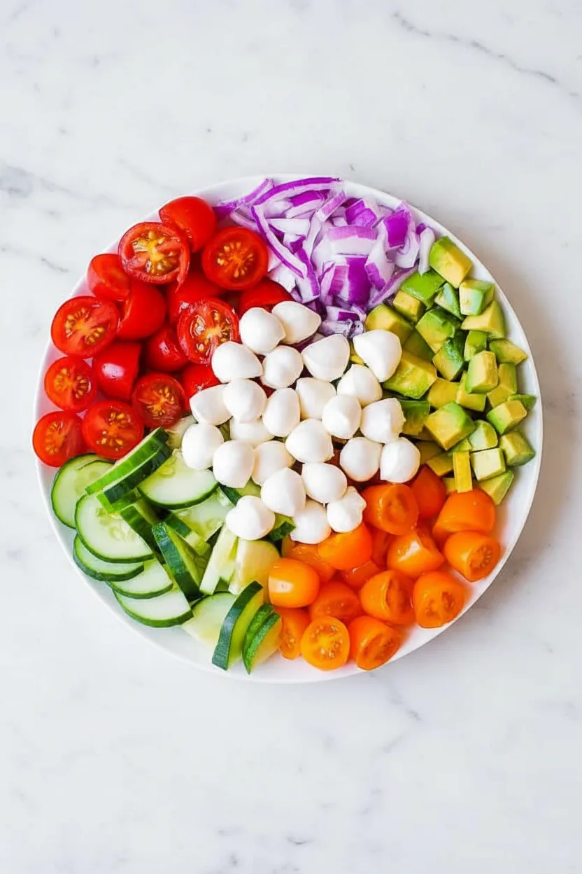 First, set a cutting board on a sturdy surface and wash all produce under running water. Halve the tomatoes over a bowl to catch any juice. Peel the avocados, cut them in half, remove the pit, and dice the flesh into bite‑sized cubes. Slice the cucumber lengthwise into thin half‑moons, then cut into smaller wedges for easier chewing. Dice the red onion finely, and place all chopped items into a large bowl to keep them combined and ready for dressing.