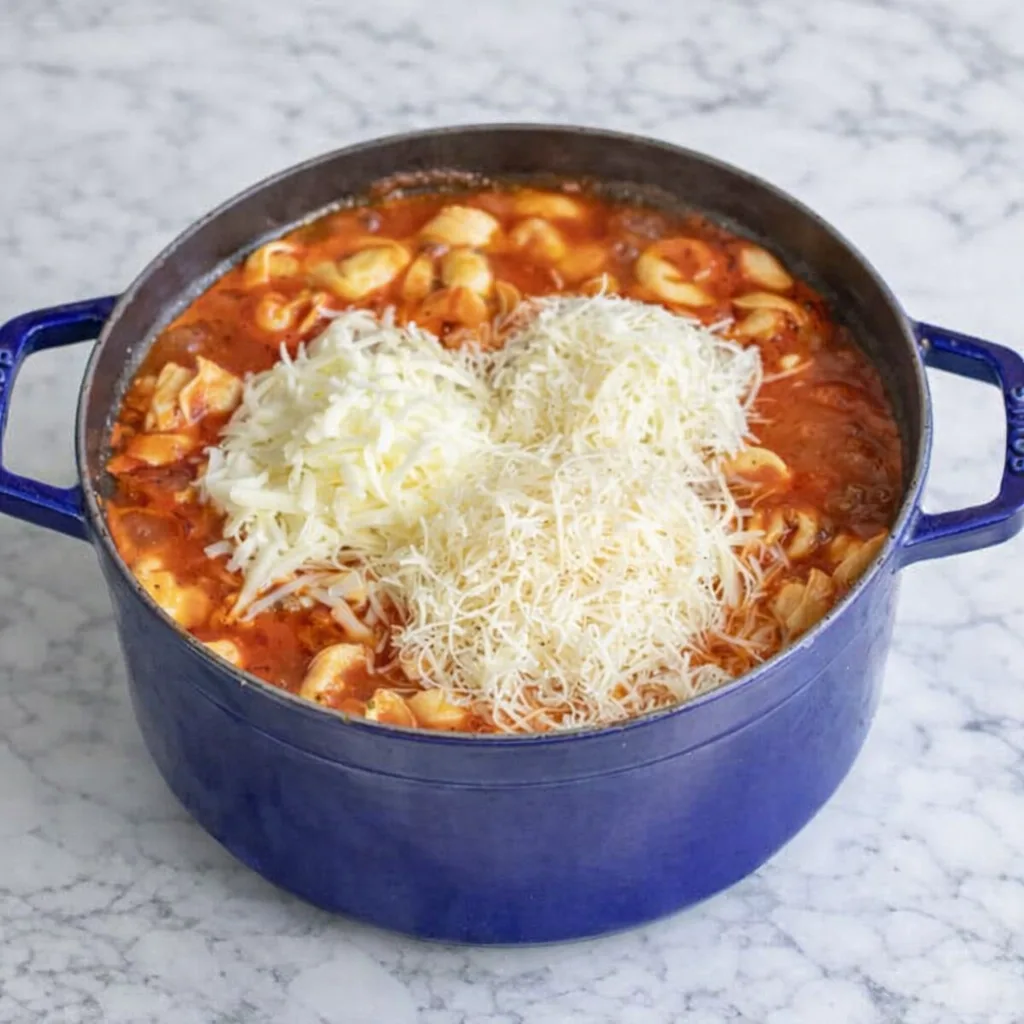 Fresh cheese tortellini stars here. Mozzarella, Romano, and Parmesan melt into creamy perfection. Garnish with fresh parsley for color. Omit Romano for simpler cheese blends if needed.